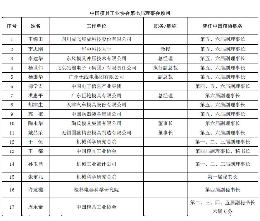 中國(guó)模具工業(yè)協(xié)會(huì)第七屆理事會(huì)顧問(wèn)