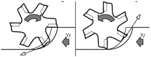 在高效切削加工中,應(yīng)盡量選用順銑加工,因?yàn)樵陧樸姇r(shí),刀具剛切入工件產(chǎn)生的切屑厚度為最大,隨后逐漸減小。在逆銑時(shí),刀具剛切入工件產(chǎn)生的切屑厚度為最小,隨后逐漸增厚,這樣增加了刀具與工件的摩擦,在刀刃上產(chǎn)生大量熱,所以在逆銑中產(chǎn)生的熱量比在順銑時(shí)多很多,徑向力也大大增加,緩解了高硬度切削時(shí)切削熱對(duì)刀具的損傷。同時(shí)在逆銑中刀刃受力狀態(tài)較順銑更為惡劣,降低了刀片的使用壽命,順銑和逆銑時(shí)刀具切入工件的過(guò)程,如圖(二)所示。