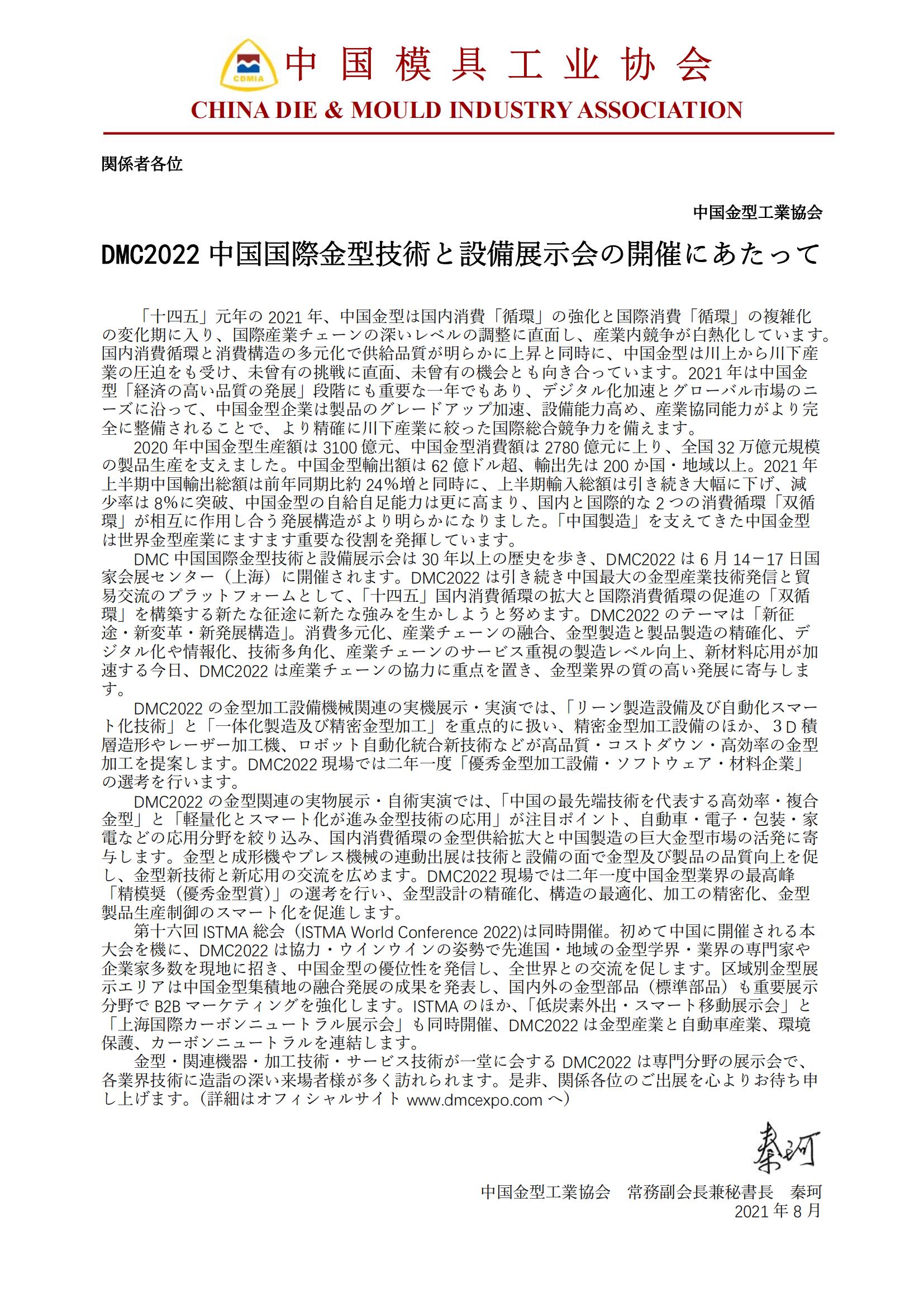 DMC2022 中國(guó)國(guó)際金型技術(shù)と設(shè)備展示會(huì)の開(kāi)催にあたって