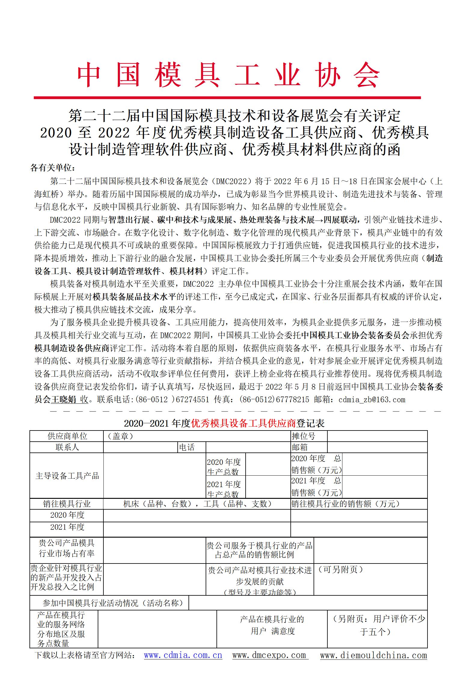 第二十二屆中國(guó)國(guó)際模具技術(shù)和設(shè)備展覽會(huì)有關(guān)評(píng)定 2020至2022年度優(yōu)秀模具制造設(shè)備工具供應(yīng)商、優(yōu)秀模具設(shè)計(jì)制造管理軟件供應(yīng)商、優(yōu)秀模具材料供應(yīng)商的函 |