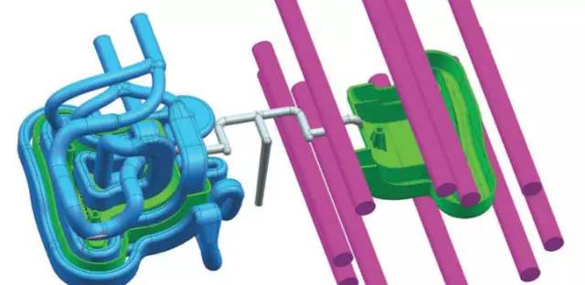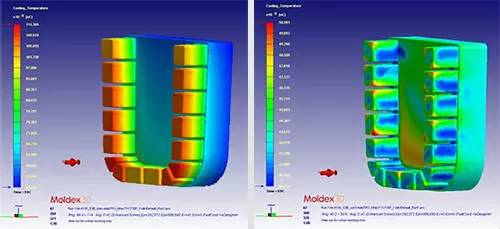 該案例中冷卻通道十分長(zhǎng)而且貼近模具表面,帶來(lái)了極佳的冷卻效果,使得模具周期減少了15%到45%,并且提高了最終產(chǎn)品的質(zhì)量。