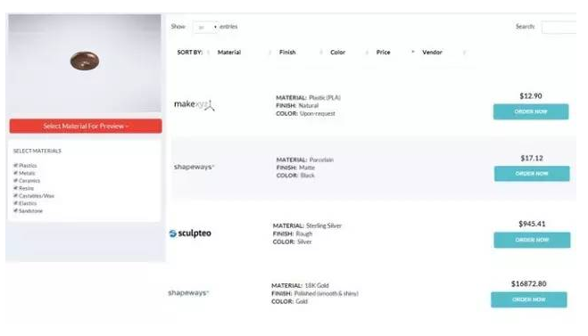 3D Printler 總共列出了172種打印方案,上圖中截取了其中4種不同材料的打印方案, PLA、瓷土、銀和18K金,價(jià)格從12.9美元到16872.8美元不等。