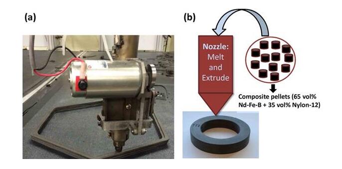 ORNL通過(guò)將NdFeB稀土粉末與聚合物混合在一起,然后通過(guò)熔融擠出頭將材料擠壓出來(lái),一層一層復(fù)合而成產(chǎn)品的形狀。復(fù)合顆粒中65%體積的材料為各向同性的NdFeB磁粉,35%體積的材料為聚酰胺(尼龍)。