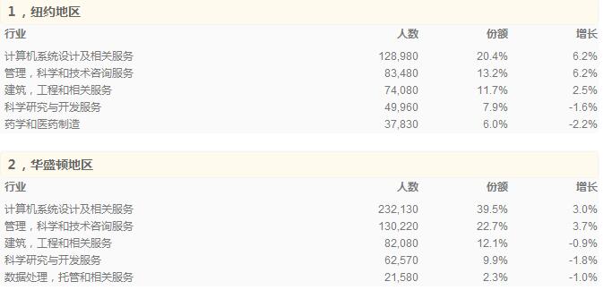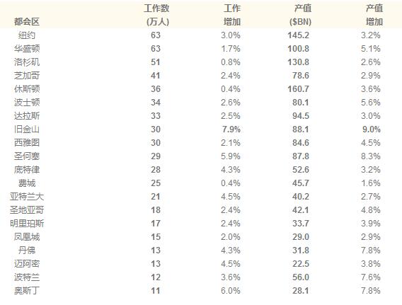 在總產值上,華盛頓、加州、波士頓等幾個都會區(qū)增加比較多?;旧虾凸ぷ鲾?shù)目的增長基本一致。