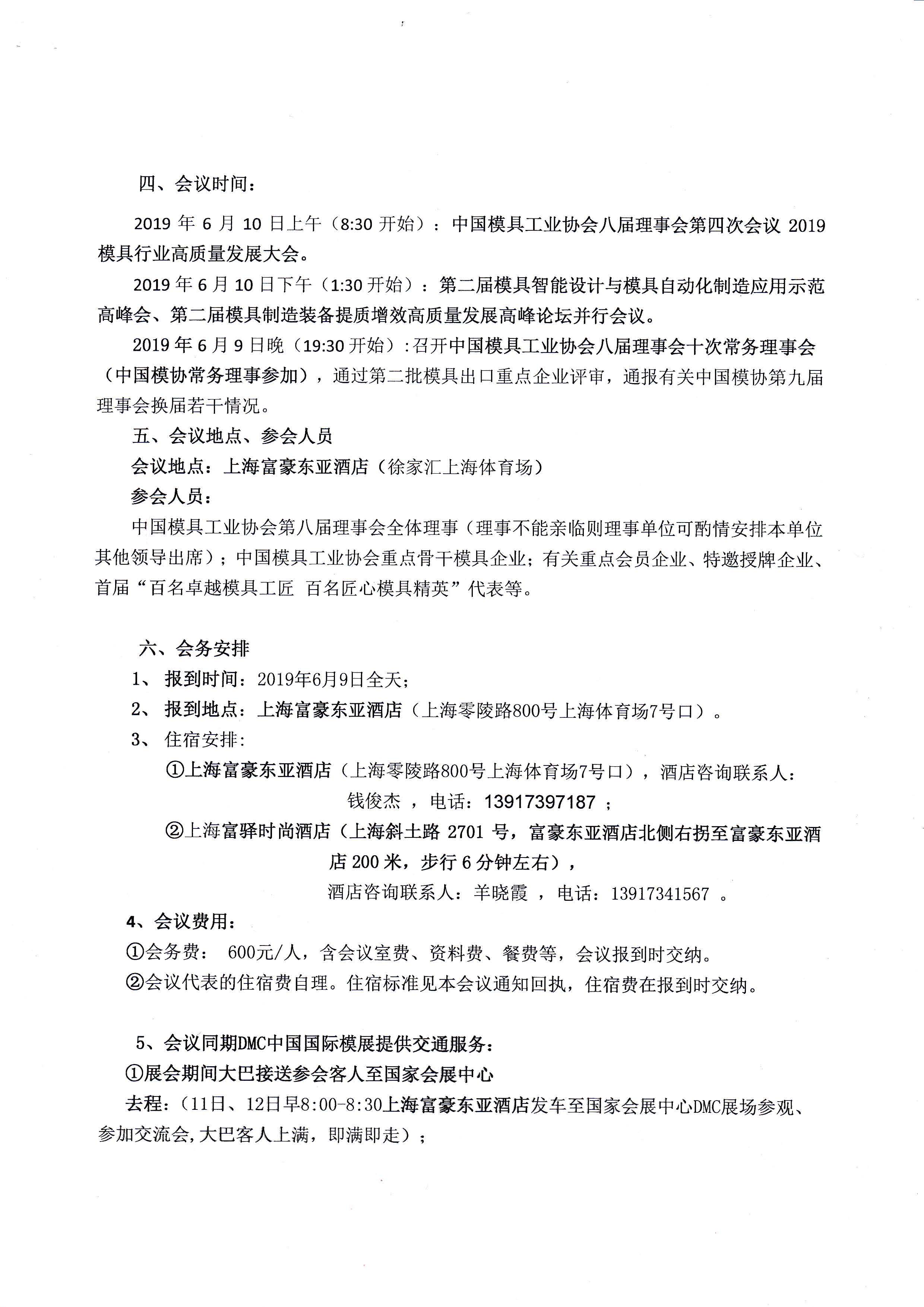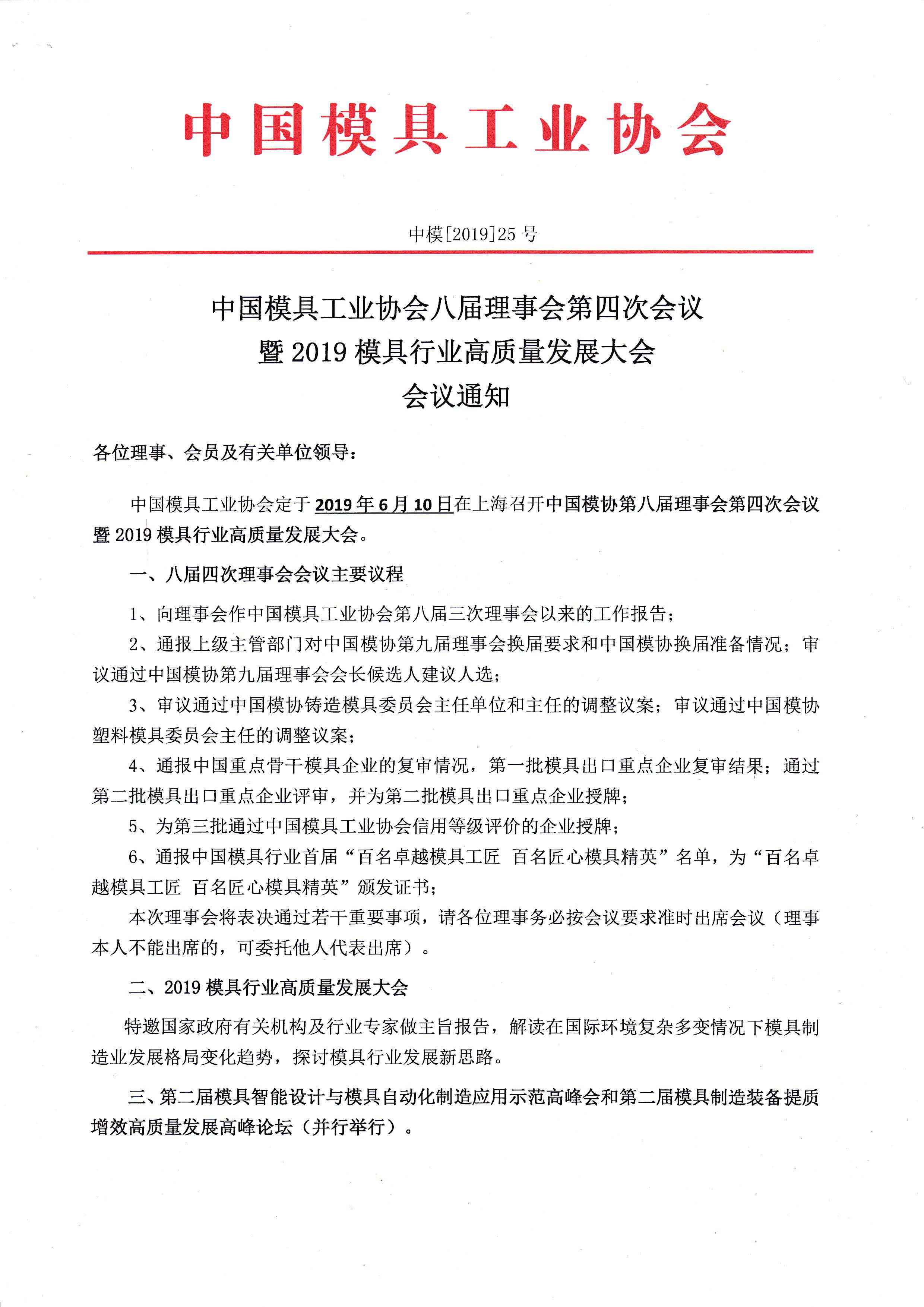 中國模具工業(yè)協(xié)會(huì)八屆理事會(huì)第四次會(huì)議暨2019模具行業(yè)高質(zhì)量發(fā)展大會(huì)會(huì)議通知